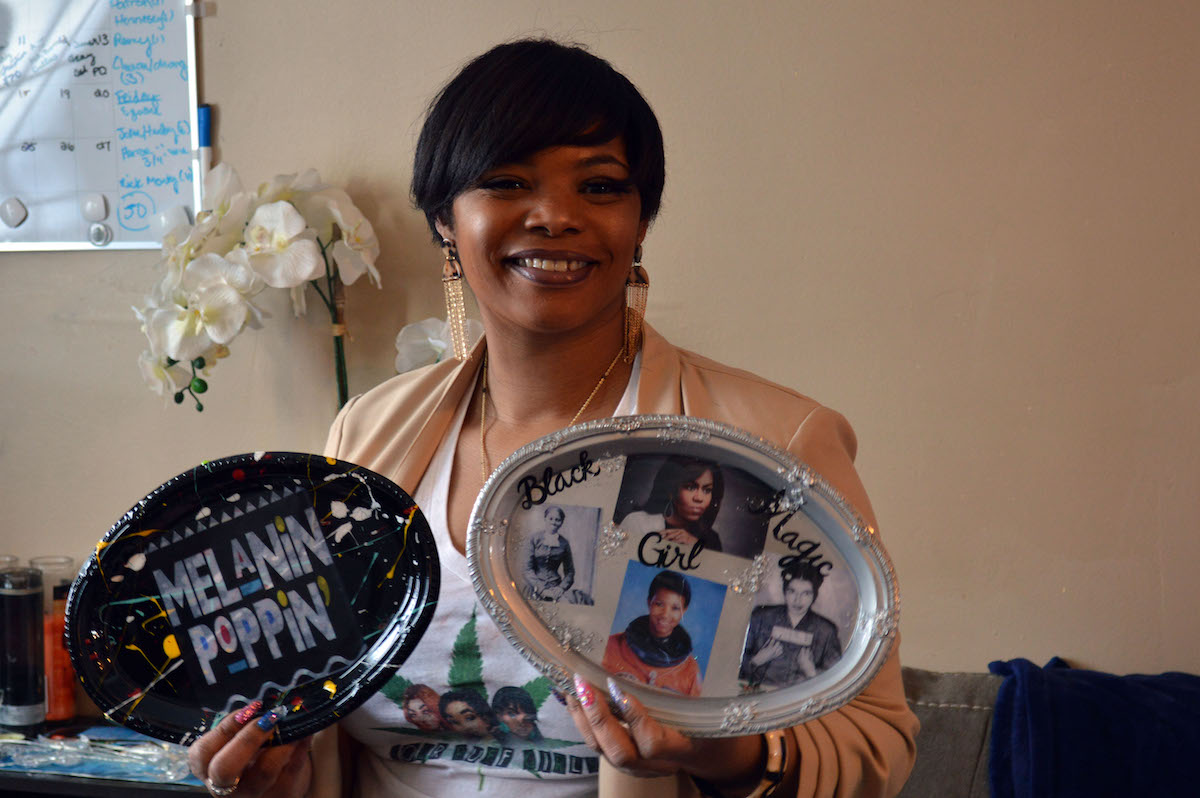 Emmau Crosby holding up two of her hand-crafted, custom ordered trays. (Vickie Babyak photo for Tube City Almanac)