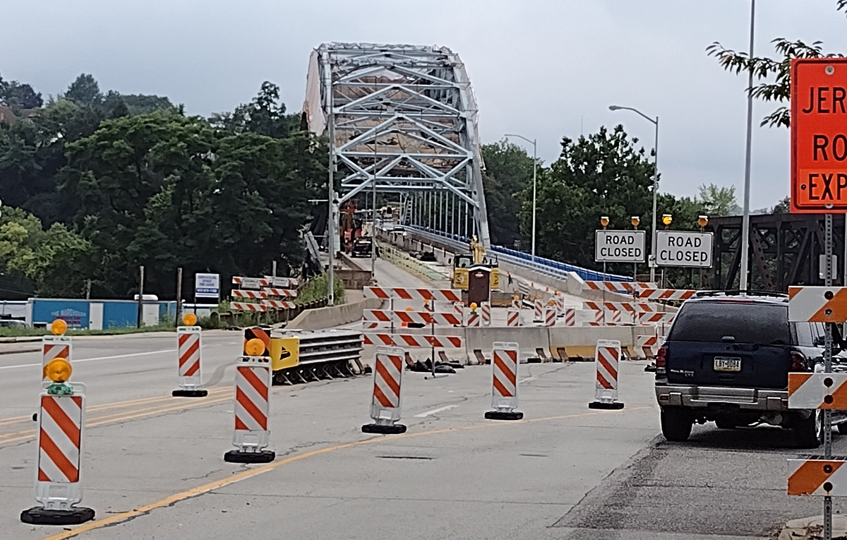 The structure is in the midst of an $15.44 million rehabilitation project that includes a new concrete deck and sidewalk, barrier repairs, full painting, structural steel repairs, concrete substructure repairs, bearing replacement, and new expansion dams. The Joseph B. Fay Co. of Tarentum is the prime contractor.