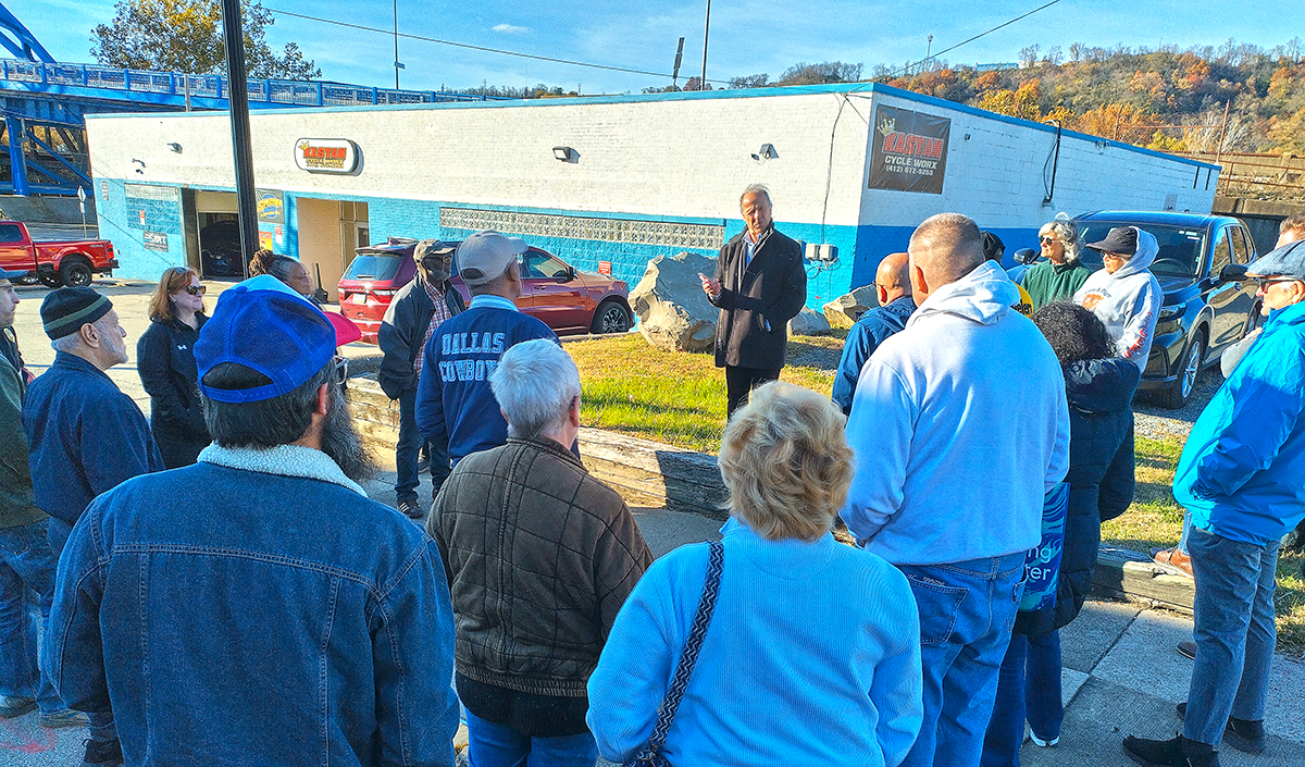 Ed Shoucair, president and co-founder of The Collaborative, prepares to lead a group of about 30 residents on a walking tour Thursday afternoon in Downtown McKeesport. (Tube City Almanac photo)