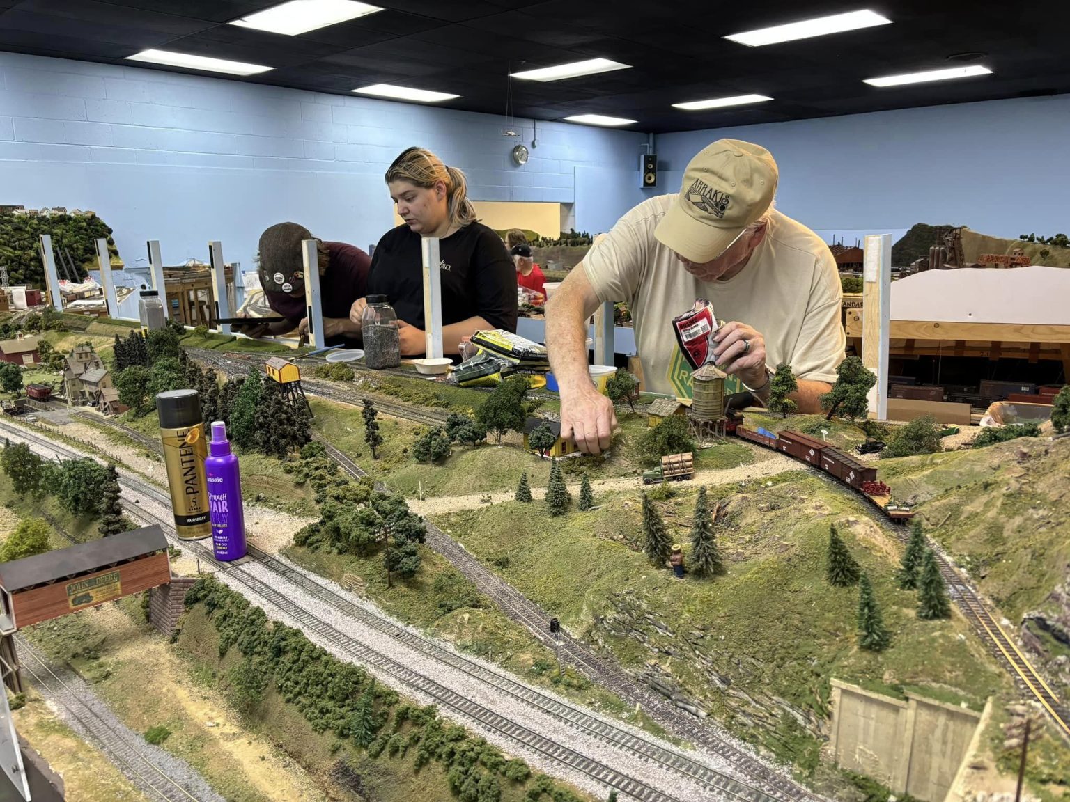 The answer is “they don’t.” The club’s 2,200-square-foot train display in HO scale (representing objects at about 1/87th of actual size) is a permanent fixture inside the non-profit organization’s building on Walnut Street in Christy Park, across from CP Industries’ Christy Park Works.