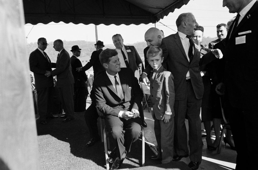 President John F. Kennedy visits with a young boy during a congressional campaign rally at the municipal parking lot at City Hall in McKeesport, Pa., Oct. 13, 1962. (Official White House photo via JFK Library.)
