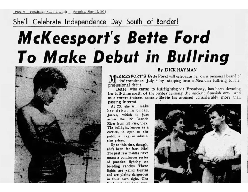 Bette Ford was born in McKeesport in 1927 as Harriet Elizabeth Dingeldein. She is a retired actress, model, and matador. Ford and her brother were raised by relatives after being abandoned by their parents. She was the first American woman to fight on foot in the Plaza México, the world's largest bullfight arena. In 1954, Warner Bros made a documentary short about her training, titled Beauty and the Bull.