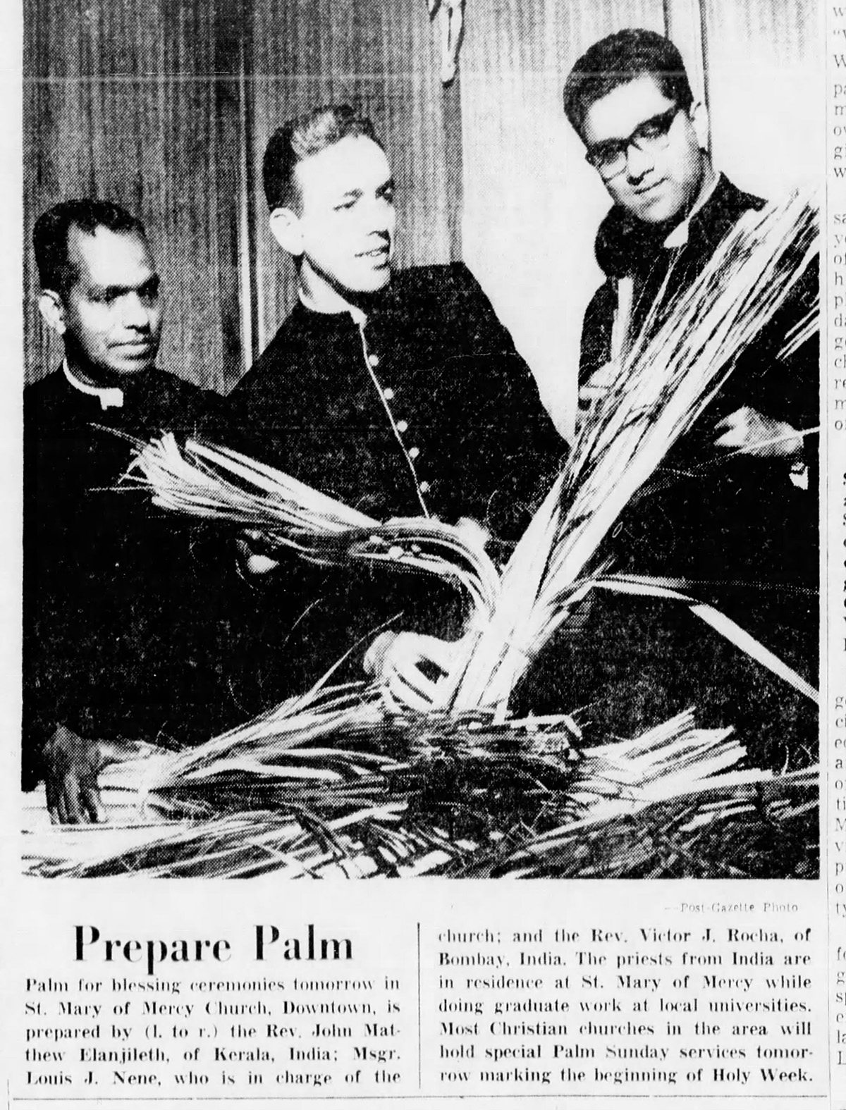 In a photo from the Pittsburgh Post-Gazette, the Rev. J. Matthew Elanjileth and two other priests prepare palms for Palm Sunday services in 1965. (Tube City Almanac collection)