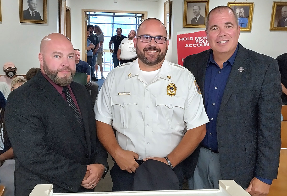 Fran Angert (center), shown with Mayor Michael Cherepko and Police Chief Josh Alfer, has been promoted to captain in charge of McKeesport police’s patrol division. (Tube City Almanac photo)